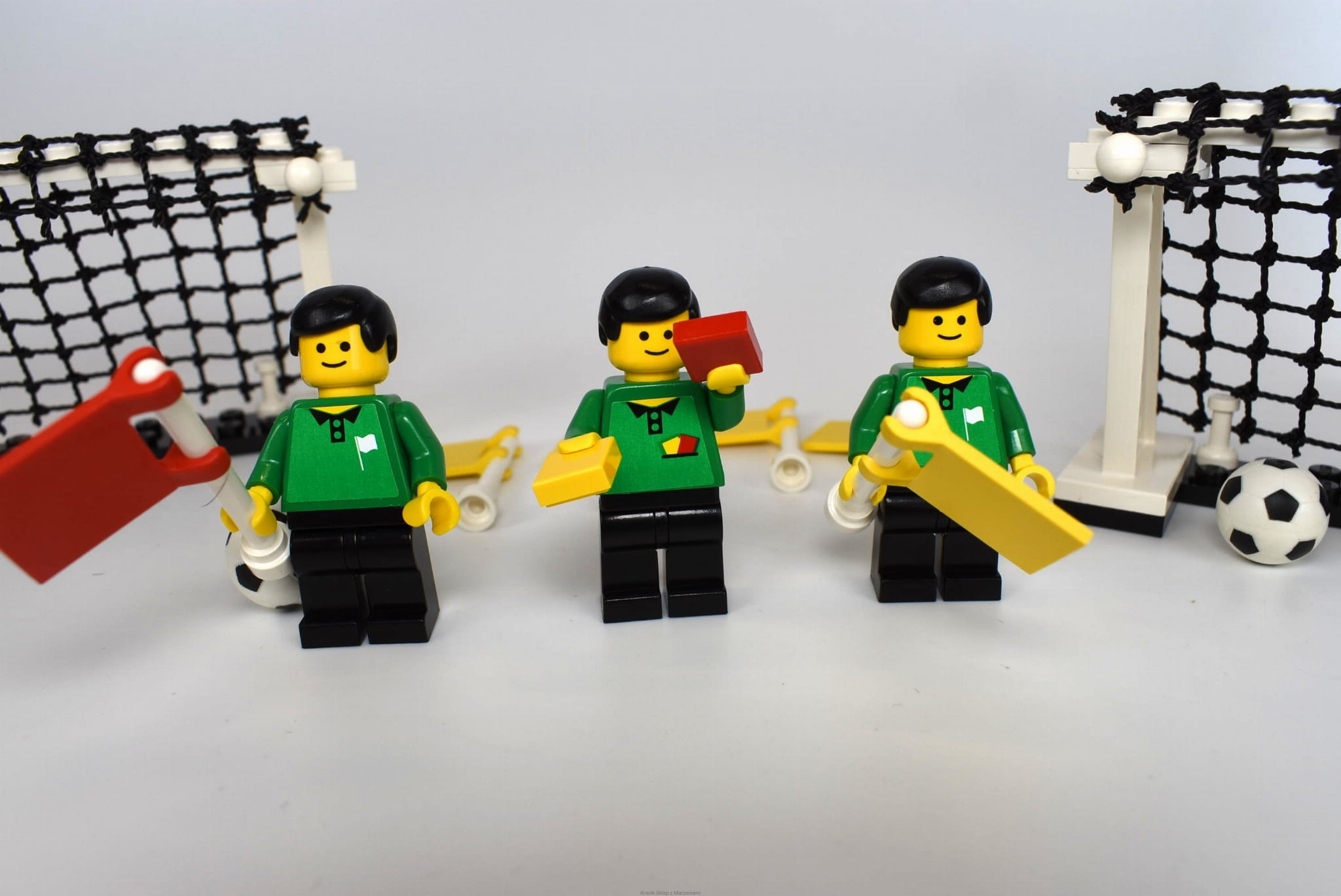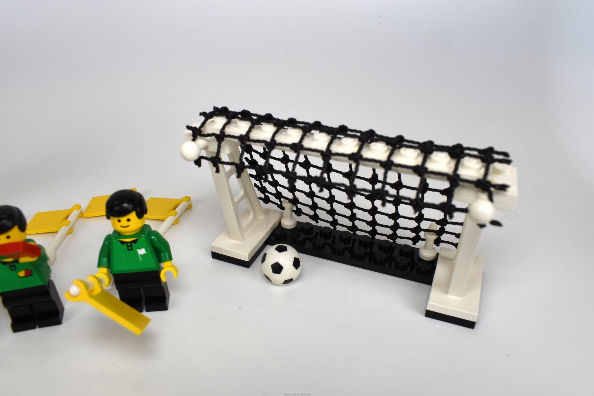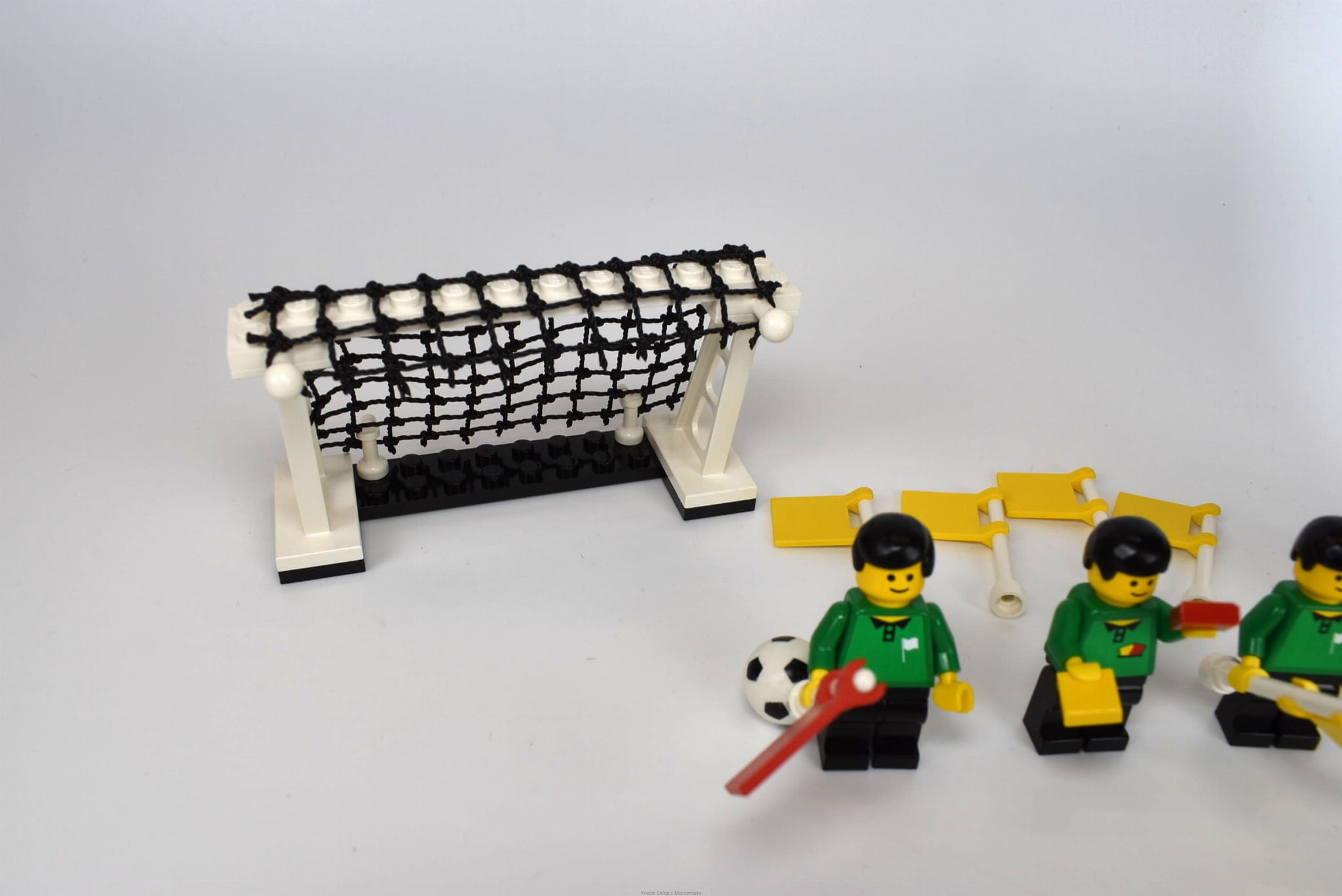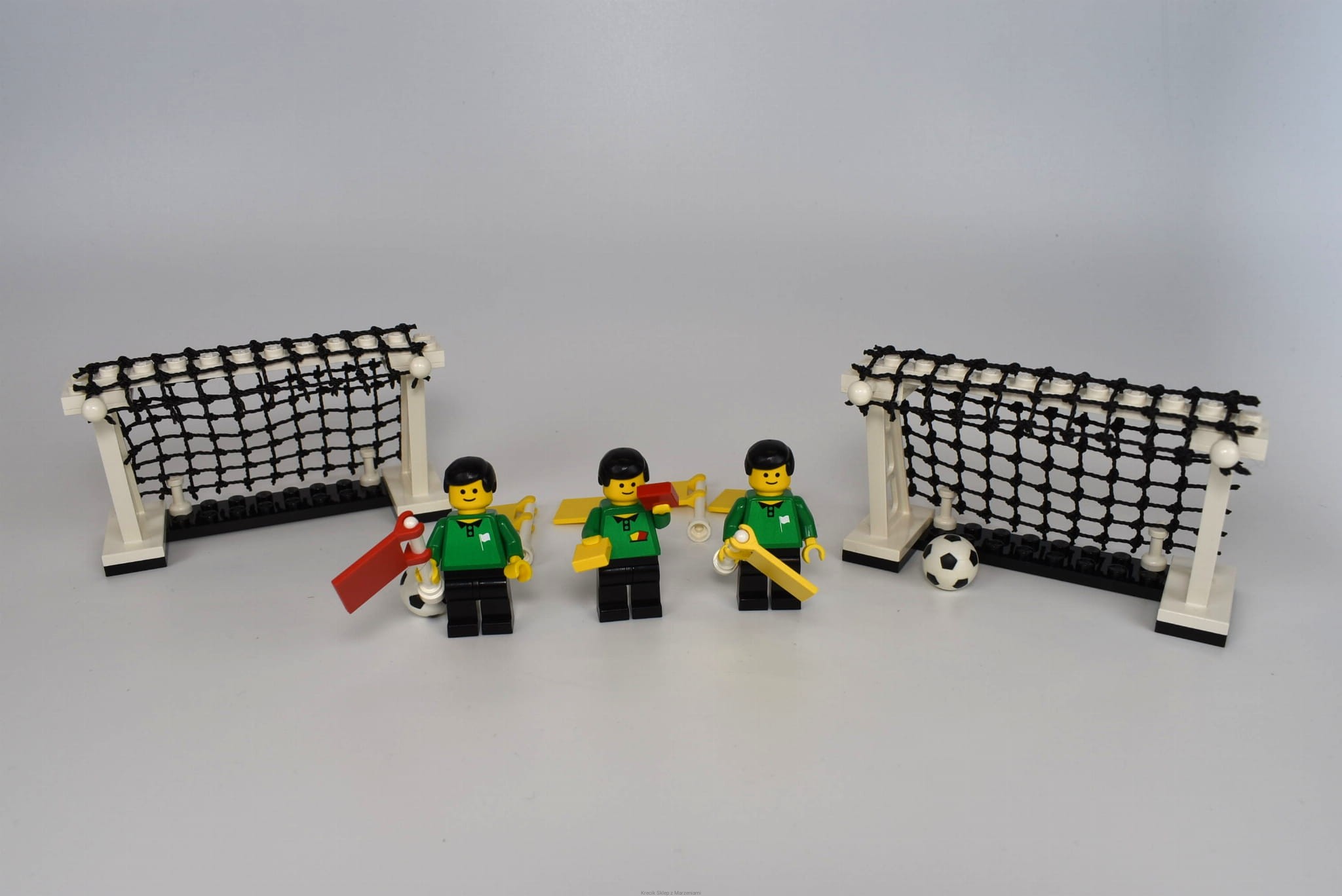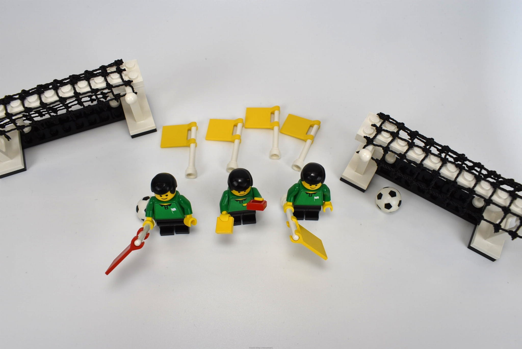 Stan klocków: Używane i bawione, ze śladami ząbków, drobne ryski, siatki w dobrym stanie, są obie piłki, zaczepy flag całe