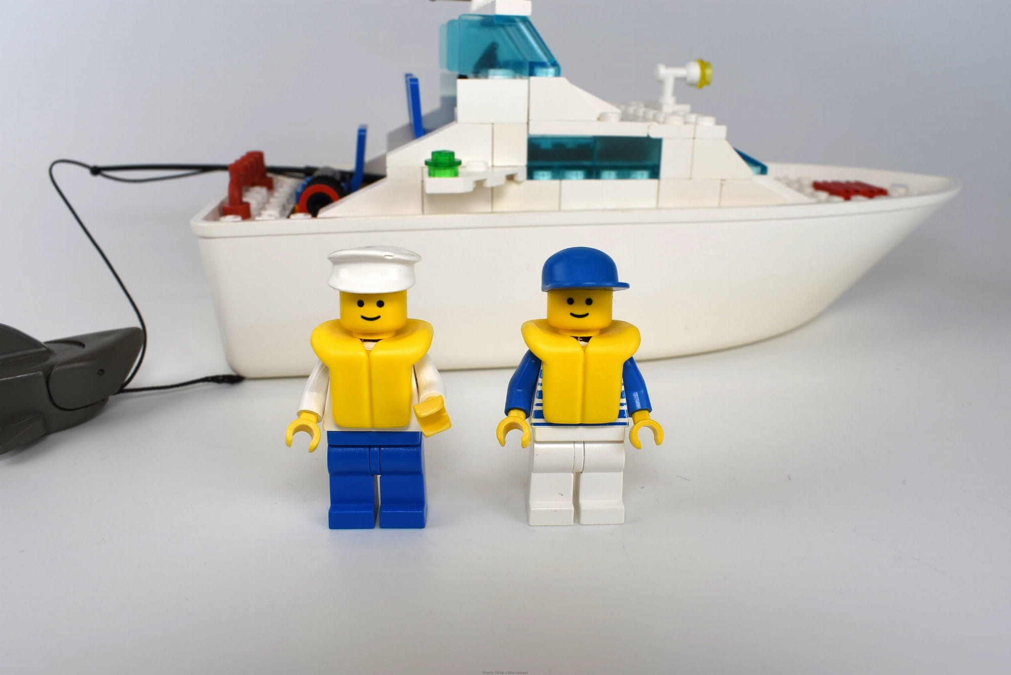 Stan klocków: Używane i bawione, ze śladami ząbków, drobne ryski, białe klocki w dość dobrym odcieniu, nie są zbyt pożółkłe, brak naklejek na kadłubie, linka nieoryginalna - dobrej jakości zamiennik