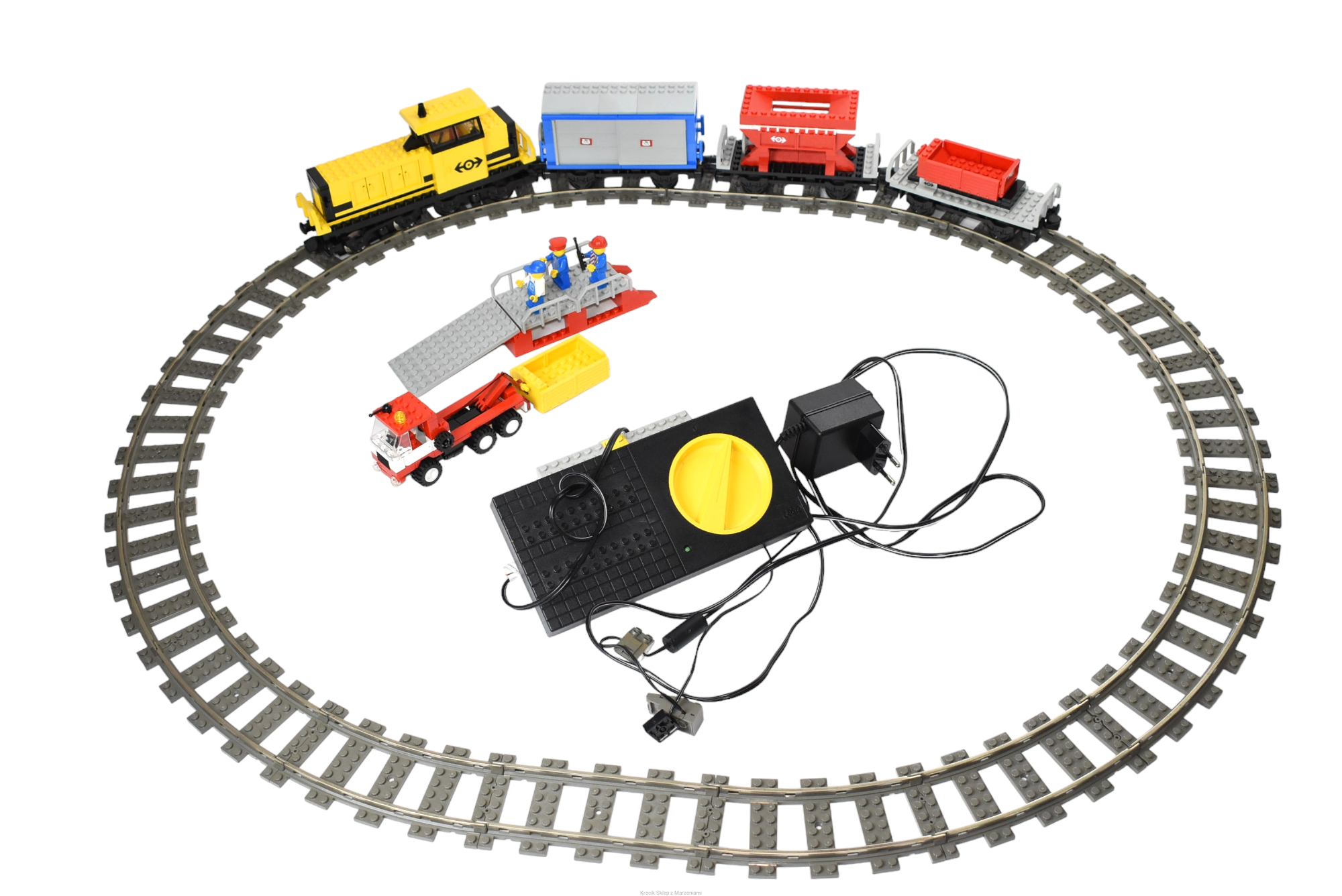 Stan klocków: Używane i bawione, ze śladami ząbków, drobne ryski, większość naklejek jest w zestawie (brak trzech na żółtych klockach 1x2), wszystkie magnesy są, wszystkie tory w zestawie, elektronika jest w całości sprawna - zestaw zawiera transformator, zasilacz oraz kable potrzebne do uruchomienia pociągu