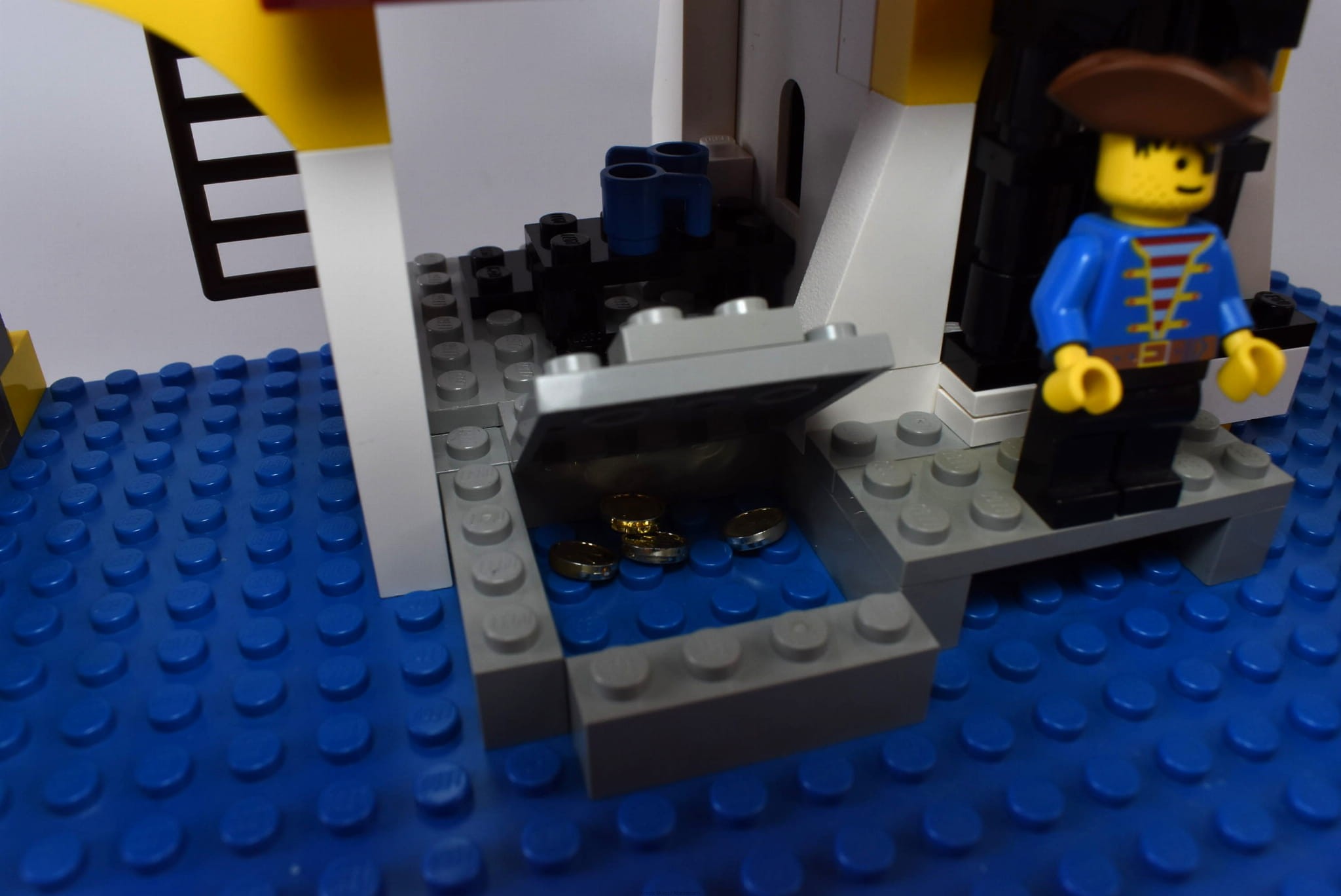 Stan klocków: Używane i bawione, ze śladami ząbków, drobne ryski, płyta bazowa w dobrym stanie, zaczepy flagi całe, komplet monet w zestawie, białe klocki w dość dobrym odcieniu, nie są zbyt pożółkłe
