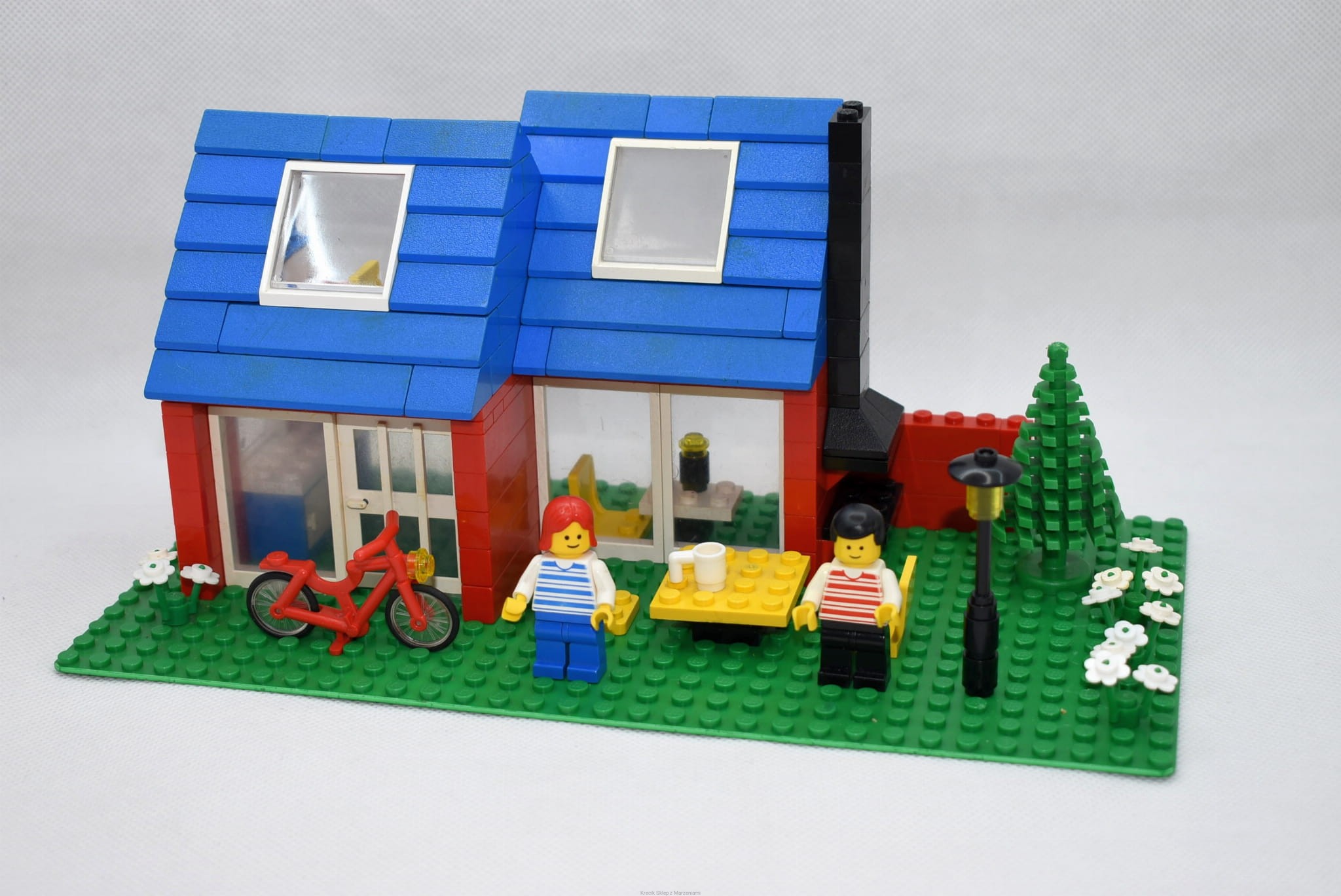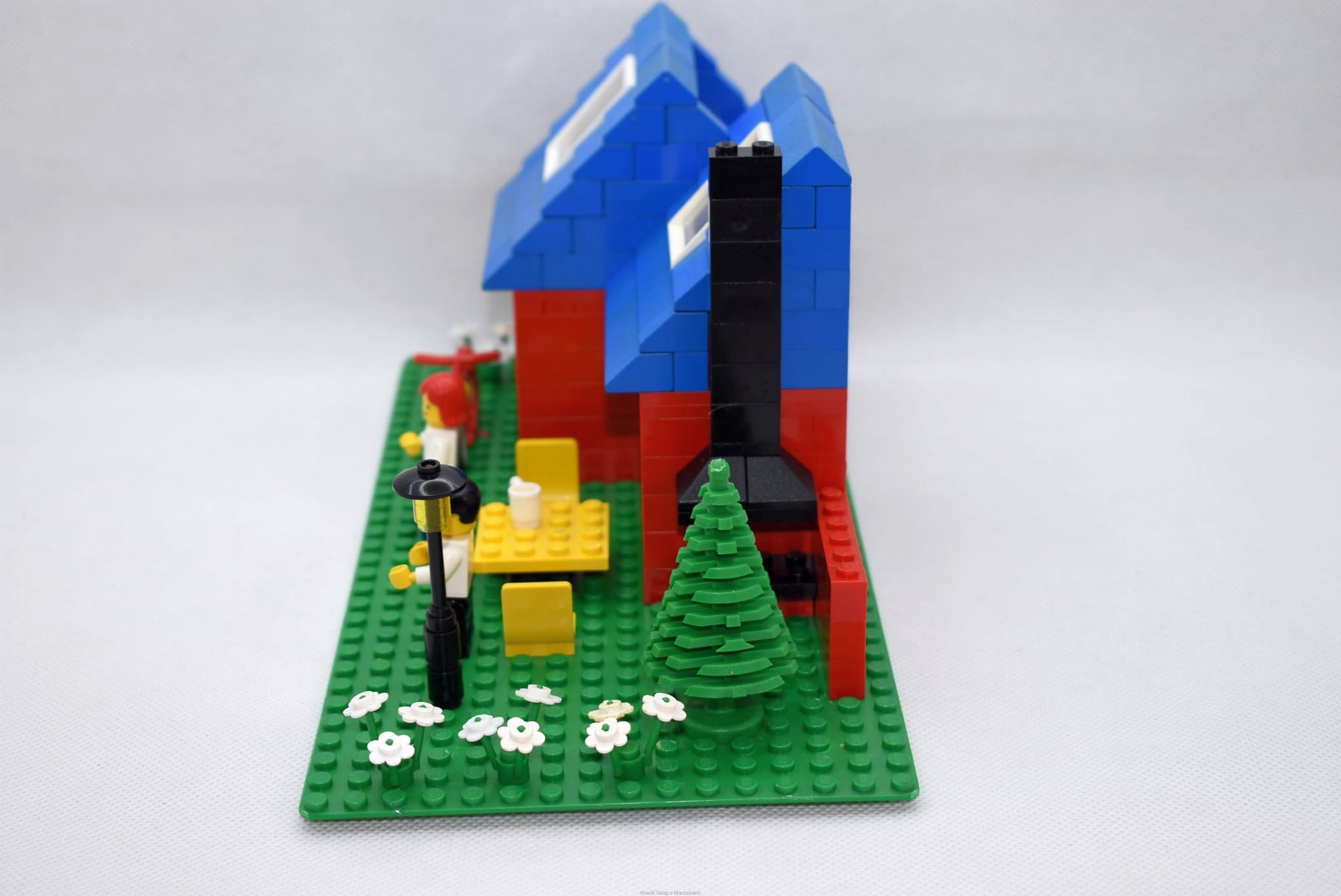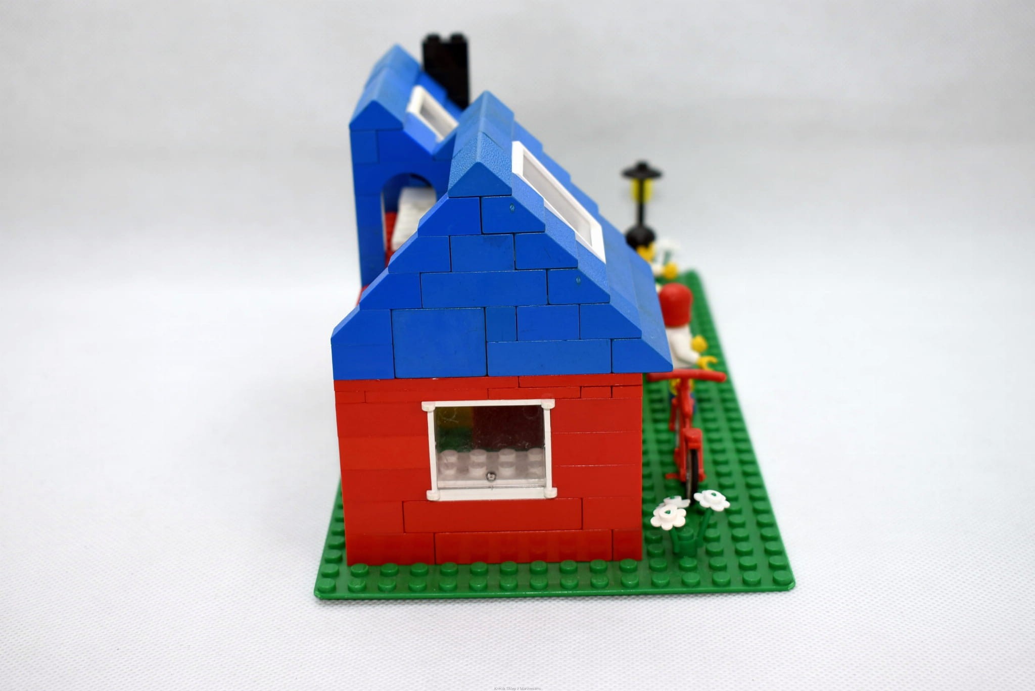 Stan klocków: Używane i bawione, ze śladami ząbków, drobne ryski, niektóre niebieskie dachówki i czerwone mury mogą mieć nieco inny odcień przez żółknięcie, komplet kwiatków, brak naklejek