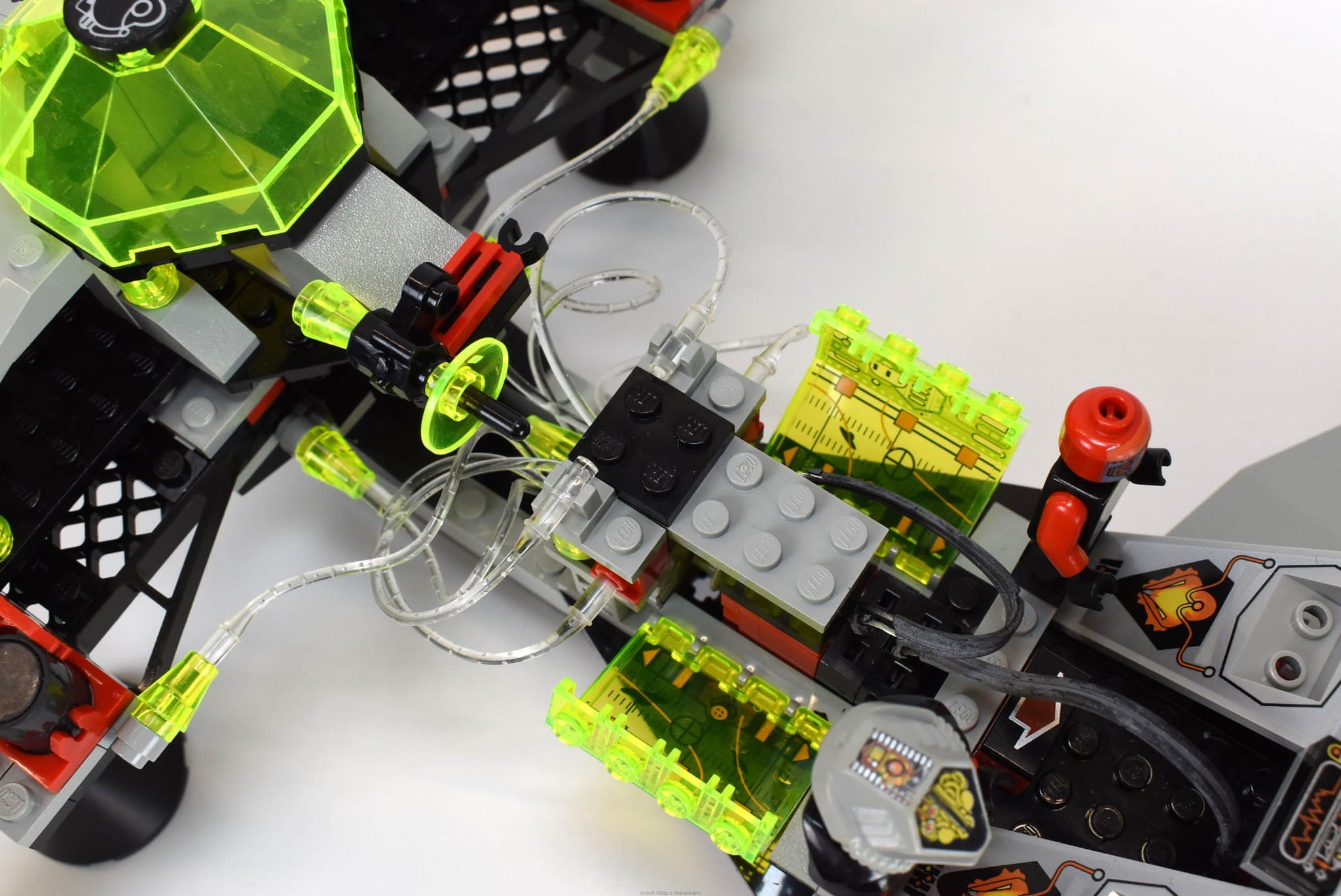 Stan klocków: Używane i bawione, ze śladami ząbków, drobne ryski, oba magnesy w zestawie, są wszystkie światłowody, jest naklejka zmieniająca kolor, elektronika sprawna - światła i silniczek (zestaw wymaga dużej baterii 9V - UWAGA: nie jest dołączona do zestawu!), kable połączeniowe mają spore ubytki izolacji (sparciała po latach i się "sypie"), ale działają poprawnie, wszystkie zaczepy całe, wszystkie akcesoria i drobne elementy w zestawie.