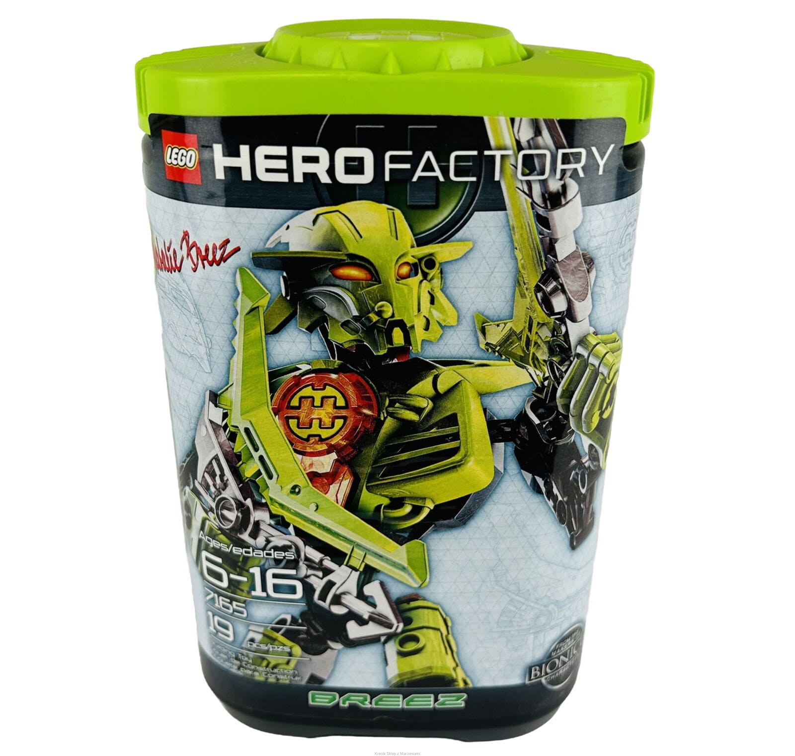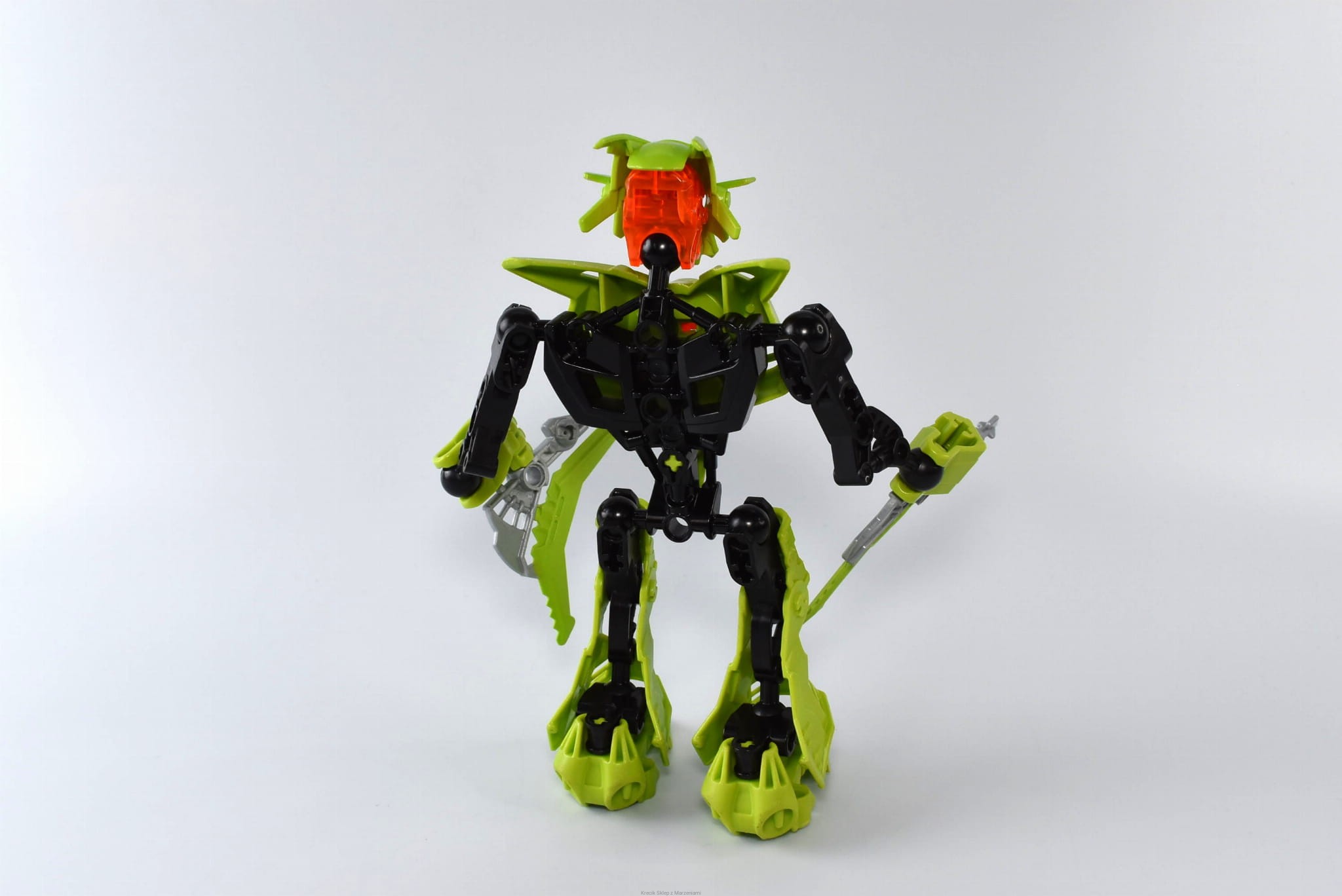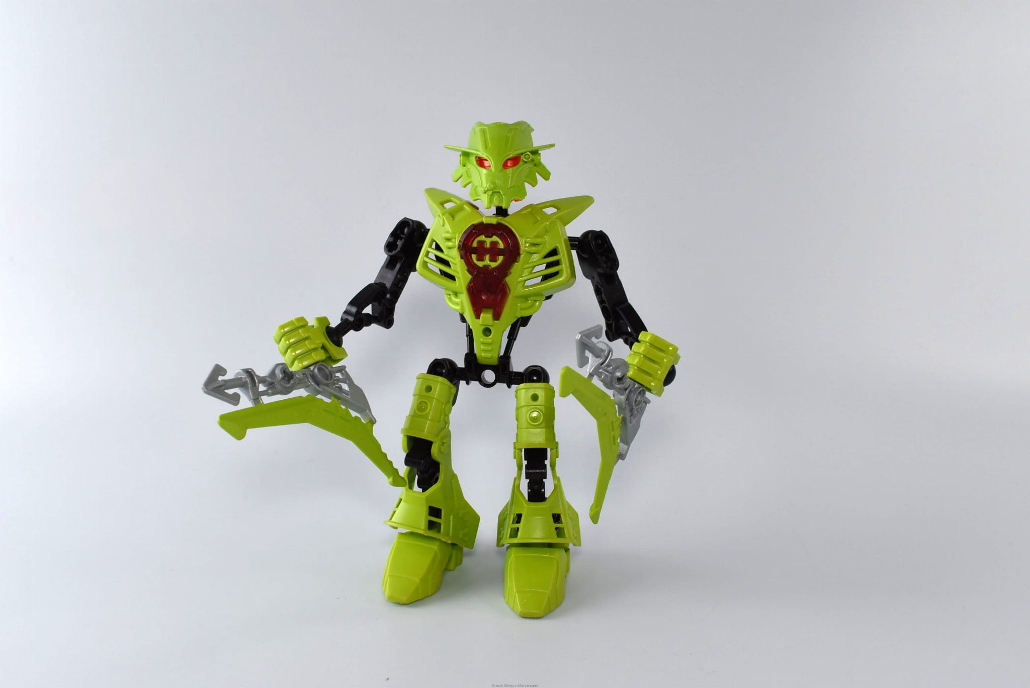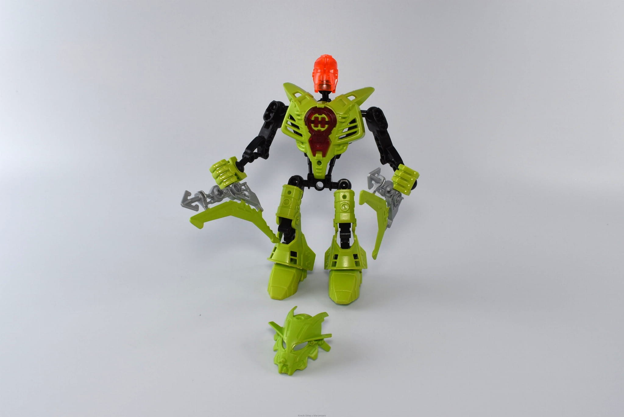 Stan klocków: Używane i bawione, ze śladami ząbków, drobne ryski, wszystkie zaczepy całe, srebrno-zielona broń ma po jednym pękniętym łączeniu
