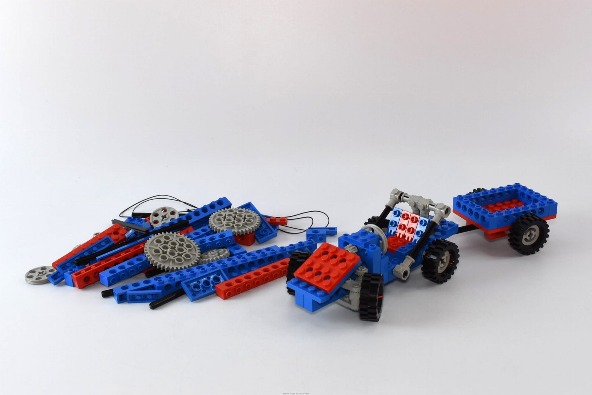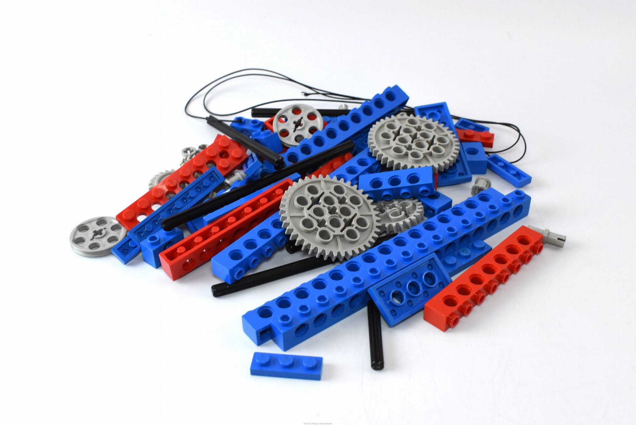 Stan klocków: Używane i bawione, ze śladami ząbków, drobne ryski, zestaw zawiera wszystkie klocki do budowy modeli alternatywnych, linka prawdopodobnie nieoryginalna