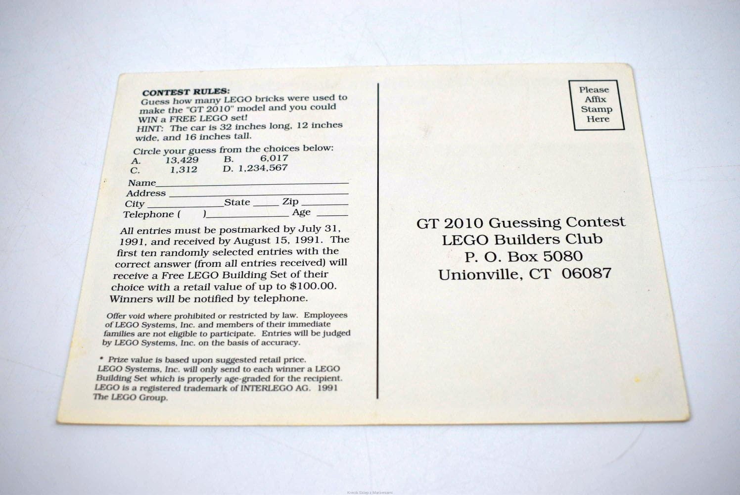 LEGO pocztówka postcard The GT 2010 [1991] A6 [pc91bcc2] - Lego Builders Club UNIKAT